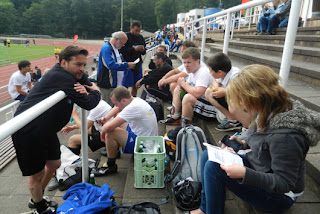 Weiter ging es im Viertelfinale und auch hier schienen die "Papier-Kicker" noch immer nicht genug zu haben! Mittlerweile waren kaum noch Wolken am Himmel und die Sonne packte noch ein weiteres Päckchen auf die Schultern aller Spielerinnen und Spieler! Aber auch die Hitze schien den in blau-weiß auftretenden Hagemännern nichts anzuhaben - ganz im Gegenteil! Immer konsequent im Abschluss konnten sie sich mit einem deutlichen 6:3 gegen "Mittelhessen Mail" für das Halbfinale beim Firmen-Fußball-Cup qualifizieren.